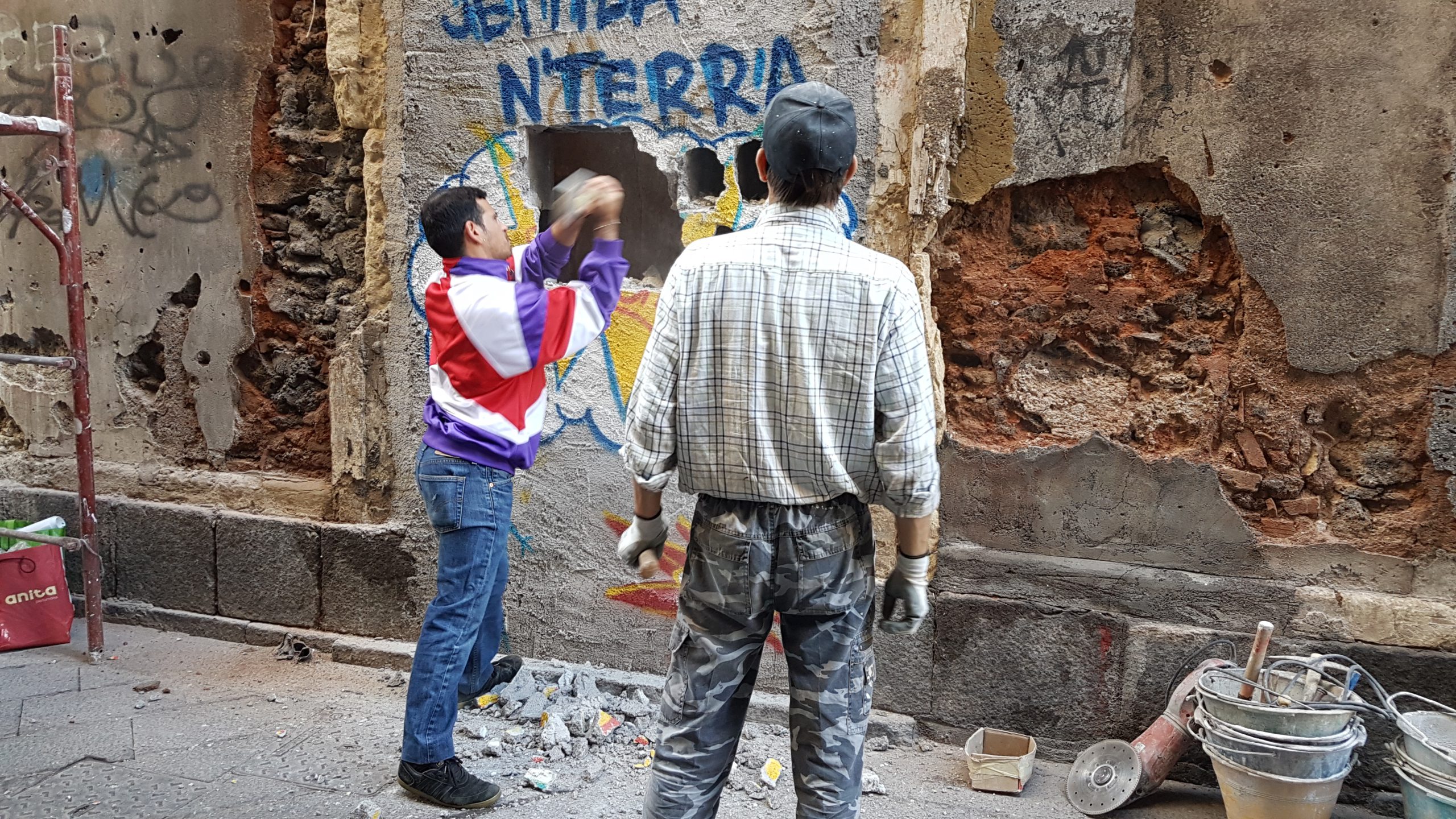 distrutta stamattina a colpi di piccone e martello, sulle note di Vita spericolata e Albachiara di Vasco Rossi, una delle porte murate del palazzo De Gaetani, edificio storico che sorge nel cuore di San Berillo, tra via delle Finanze e via Pistone, destinato a diventare un centro di documentazione sulla storia del quartiere e dei suoi abitanti. Sono loro che – insieme ai ragazzi dell’associazione Trame di quartiere, attivi nel rione con diverse iniziative e gestori della bottega in comodato d’uso – hanno preso parte a quello che da un semplice lavoro di muratura si è trasformato in un messaggio alla città, al Comune e ai proprietari degli immobili che dagli anni Cinquanta, per evitare occupazioni o per questioni di sicurezza, sono stati letteralmente murati.