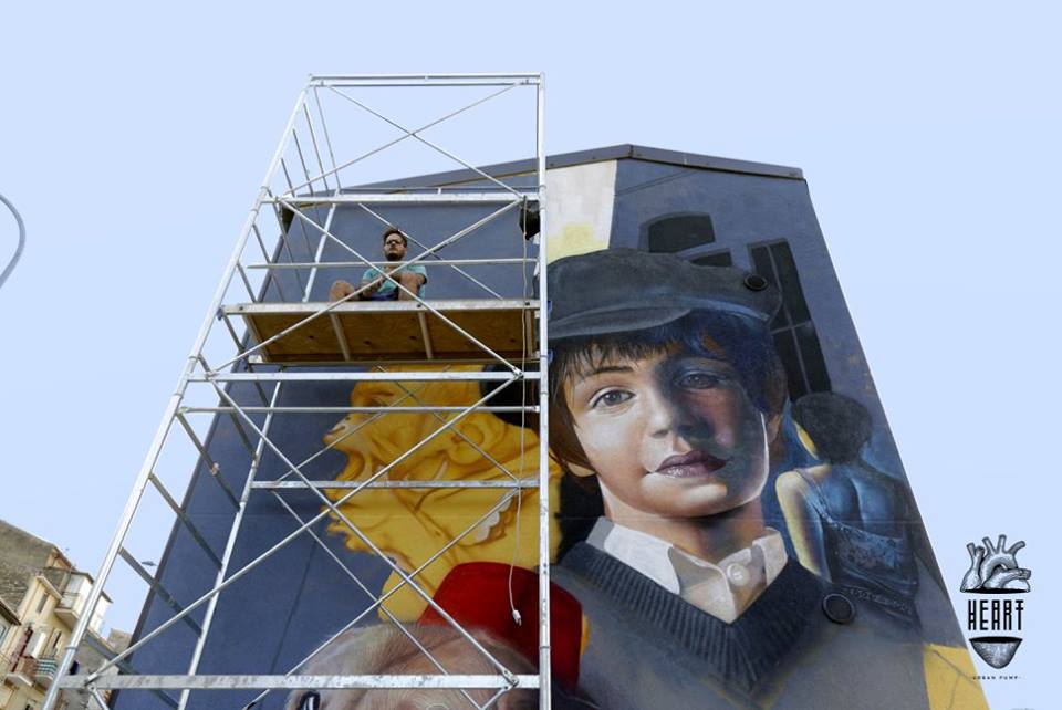 Ii quattro graffitisti hanno realizzato un murales sulla facciata di un edificio in via Lauricella, nel quartiere di San Giuseppe, a pochi chilometri dal lago Soprano, una delle riserve naturali più suggestive della Sicilia. Lo stabile in questione, dato in concessione da un privato agli artisti, è anche la sede dello spazio He Art. L’opera, realizzata con il contributo di una ditta della zona che ha fornito, a titolo gratuito, le attrezzature per le impalcature, è un omaggio che i giovani creativi hanno fatto alla città. «Ci tenevo a dipingere il mio paese e a restituire nuova vita agli spazi urbani»,racconta Rosk, serradifalchese d’origine.