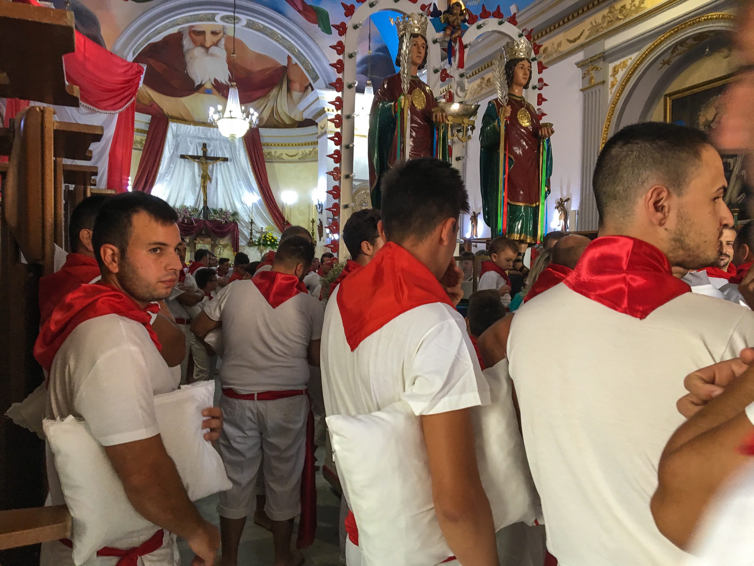 A piedi nudi, vestiti di bianco con i fianchi e il collo cinti da un fazzoletto rosso (colore del martirio), giovani e anziani si danno il cambio in una marcia lunga circa dodici ore, tra corse estenuanti, stanchezza e dolore ai piedi, alle spalle e alle mani impegnate a sorreggere le travi di legno della vara. Una manifestazione religiosa atipica dove le sagome dei santi ballano tra la folla al ritmo della Fanfara dei Bersaglieri, Rosamunda e Funiculì funiculà. Durante tutta la processione sono centinaia i bambini sollevati in braccio dai propri genitori e affidati ai due uomini della Confraternita in piedi sulla vara che, in un gesto di devozione simbolica, li consacrano ai Santi. La processione si conclude a notte fonda con l’attesissima ballata finale e gli spettacolari giochi pirotecnici famosi in tutta la provincia di Palermo.