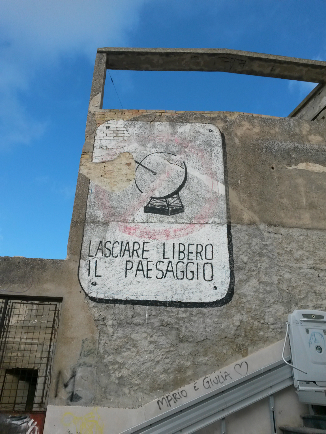 Non se la passa meglio il murales del belvedere. Lì, in fondo al corso principale del paese, da dove nelle giornate terse è possibile guardare fino a Gela, è disegnato un grande divieto di Muos, con la scritta «Lasciate libero il paesaggio». Che però si sta sgretolando. Mentre la terza opera, nel quartiere Quartararo, – un soldato con divisa statunitense batte due bacchette a forma di teschio su uno strumento fatto di lanciamissili – «continua a rimanere priva di illuminazione», denunciano gli attivisti. Che lanciano un appello all’amministrazione e ai cittadini «affinché si inverta l’involuzione civica che da tanto, troppo tempo, colpisce il nostro paese e le sue bellezze. Invitiamo – aggiungono – l’amministrazione a curare maggiormente quel patrimonio comune che molti artisti hanno deciso di donare alla città, mediante la manutenzione ordinaria delle opere e la corretta illuminazione delle stessa al fine di rendere veramente fruibile alcune delle eccellenze che il territorio offre, anche grazie all’impegno economico e sociale del comitato No Muos».
