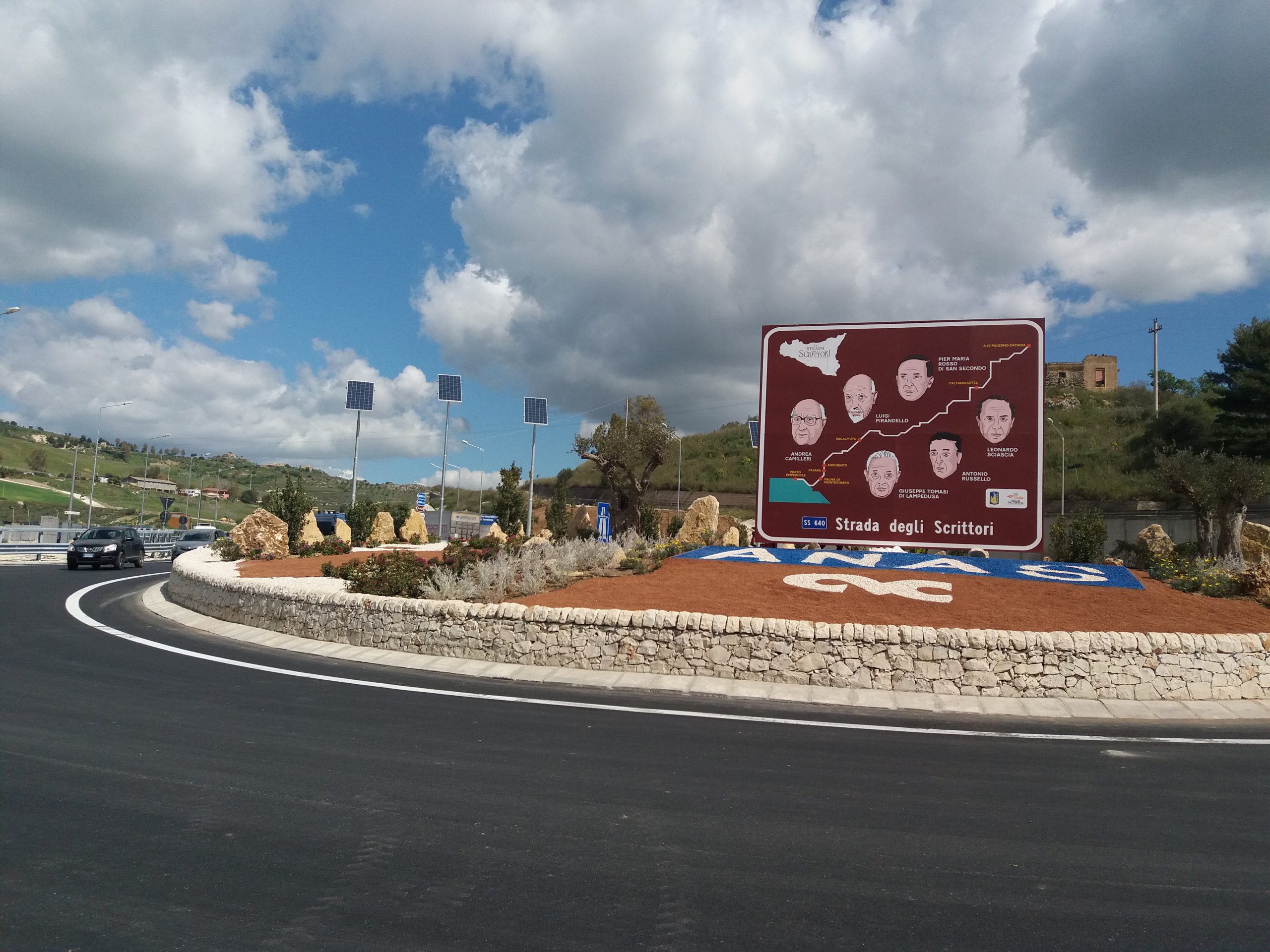 Sono passati otto anni, il doppio di quelli previsti, dalla posa della prima pietra della nuova statale 640 che l’attuale ministro degli esteri, l’agrigentino Angelino Alfano aveva dedicato alle vittime di quella strada. Dopo otto anni è stato inaugurato il primo lotto di quella che è divenuta la strada degli scrittori. Oltre 31 chilometri di asfalto, da Porto Empedocle, in provincia di Agrigento, a Serradifalco, provincia di Caltanissetta. La rotonda San Pietro addobbata a festa dove spicca un grande cartello stradale con le raffigurazioni dei grandi scrittori della provincia agrigentina: Andrea Camilleri, Giuseppe Tomasi di Lampedusa, Antonio Russello, Luigi Pirandello, Leonardo Sciascia e il nisseno Pier Maria Rosso di San Secondo.