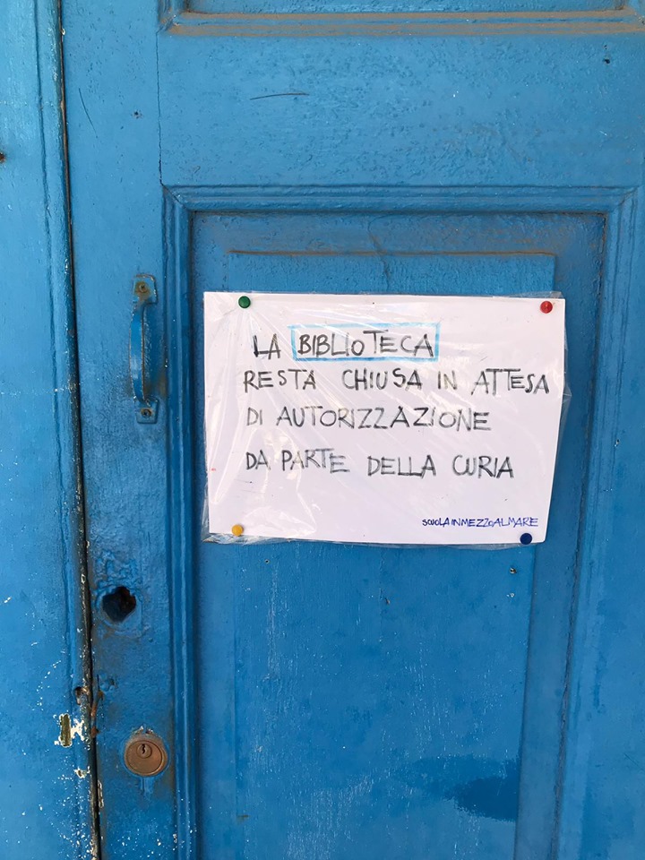 «La biblioteca resta chiusa in attesa di autorizzazione da parte della Curia». Un cartello scritto a mano in stampatello con un pennarello nero e affisso su una porta di legno colorato di azzurro. Dietro quella porta chiusa ci sono oltre tremila libri raccolti dall’associazione culturale Scuola in mezzo al mare di Stromboli negli otto anni in cui le volontarie hanno svolto attività per i bambini e i ragazzi nei locali della parrocchia San Vincenzo Ferreri. Adesso quei locali sono stati giudicati inadeguati per il progetto.