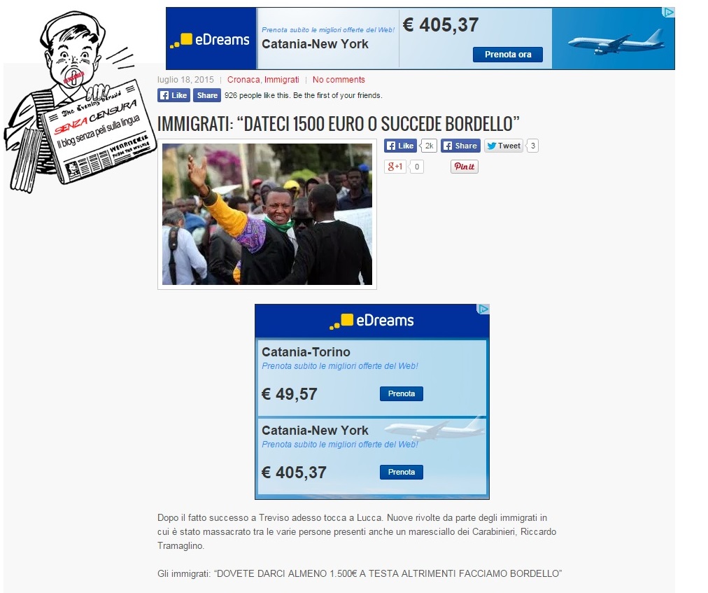 O ancora, dopo le polemiche legate alla presenza dei richiedenti asilo a Treviso, su Senzacensura compare un’altra notizia falsa che cavalca uno dei tanti luoghi comuni sui migranti: la pretesa di soldi. «Sono due anni che siamo qua e se vogliono che ce ne andiamo, devono darci 1500 euro almeno altrimenti succede un vero e proprio bordello. Con 500 euro non riusciamo neanche a pulirci il culo», sono alcune delle frasi inventate e messe sulla bocca dei migranti. Parole che generano odio in cambio di pochi euro di pubblicità. Il sito stamani è ancora attivo, anche se alcuni articoli sono già stati disattivati. La polizia postale ha concesso alcune ore al proprietario per oscurarlo.