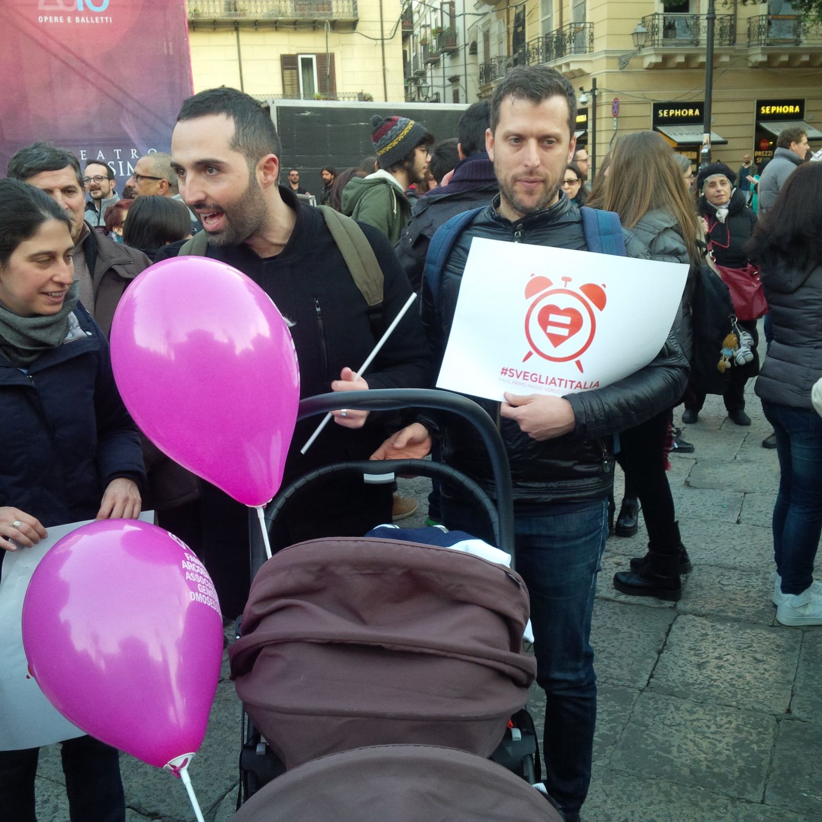 In piazza oggi a manifestare per i loro diritti ci sono anche Rosario e Federico, i primi palermitani gay ad essere iscritti al registro delle unioni civili. La coppia è stata in California e grazie alla Gta (gestazione per altri) ha due figli, ma in Italia viene riconosciuto per loro solo un genitore. «Siamo in piazza per manifestare per i nostri diritti e quelli dei nostri figli, – spiega Rosario – in Italia viene riconosciuto solo un genitore l’altro è un estraneo. Troviamo che sia un’ingiustizia. Per lo Stato siamo solo due amici, ma quelli sono i nostri figli, li amiamo. Lo Stato deve legiferare – concludono -, il disegno Cirinnà è solo una briciola occorre una continuità affettiva per i nostri figli, vogliamo pari diritti. Di famiglie arcobaleno ce ne sono molte, non si può continuare ad ignorarle. I nostri figli non sono figli di serie B!».