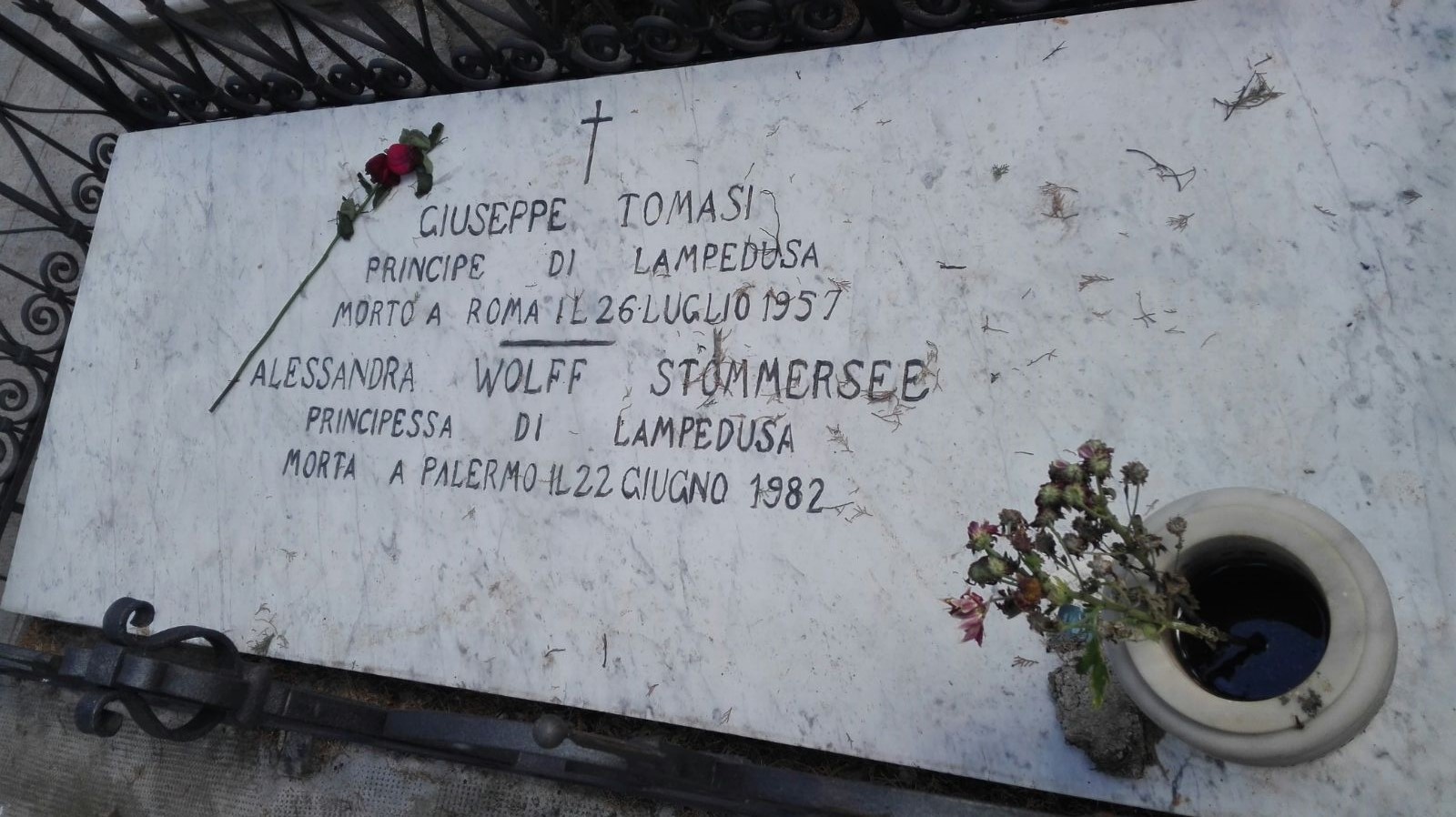 A fare compagnia allo scrittore c’è la moglie Alexandra Wolff Stomersee, detta Licy e studiosa di psicanalisi. Tante sono le belle e nobiliari cappelle che si trovano all’interno del raccolto cimitero dei Cappuccini, eppure per il principe che tanto lustro ha portato alla sua amata Sicilia non c’è che uno spazio misero e dimesso: solo una balaustra di marmo con su scritti i due nomi e le date di nascita e di morte. Sopra la sua tomba giace una rosa rossa appassita, un messaggio sbiadito dalla pioggia e un biglietto da visita di un professore del dipartimento di letteratura italiana dell’università del Messico, come a voler dire “se c’è qualcuno interessato a parlare del Principe e del suo straordinario romanzo io sono qui”.