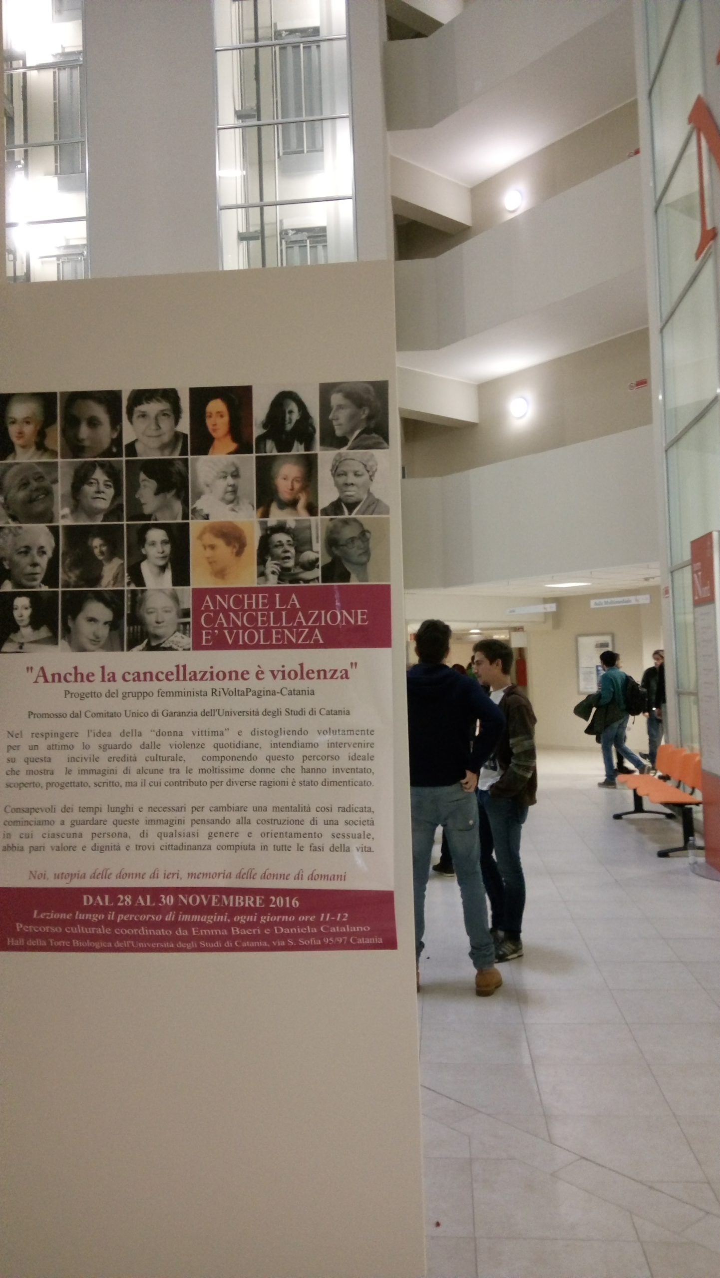 Ambizione alla base della mostra in progress, allestita tra il 2014 e il 2015, è dimostrare che il ricordo non è un esercizio fine a se stesso. L’esposizione, infatti, è stata ospitata in diverse città siciliane e in alcune regioni come Marche e Liguria, e oggi è stata ritenuta dall’Emilia Romagna «idonea a seminare il concetto della cancellazione come violenza». «L’identità e la fiducia in sé – sottolinea Baeri – si formano se c’è una memoria che ci ricorda di aver avuto delle grandi antenate». Memoria che si tramanda anche grazie a mostre come quella che in questi giorni anima gli studenti della Torre Biologica e che le femministe si augurano «possano diventare permanenti, per dare a ogni studente e a ogni studentessa la possibilità di fermarsi a leggere le storie delle donne che hanno fatto la Storia».