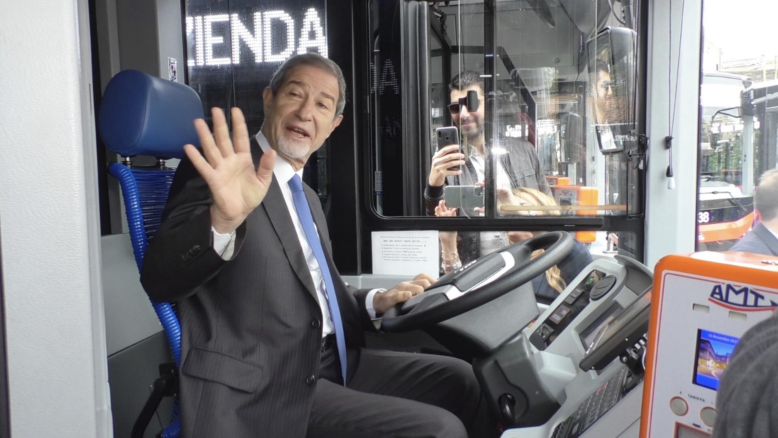 Il parcheggio dell'Azienda metropolitana trasporti di via Plebiscito si è trasformato nel palco di presidente della Regione, sindaco e presidente della partecipata. Tutti raccontano i successi di Amt, nell'attesa del nuovo contratto di servizio. Guarda le foto
