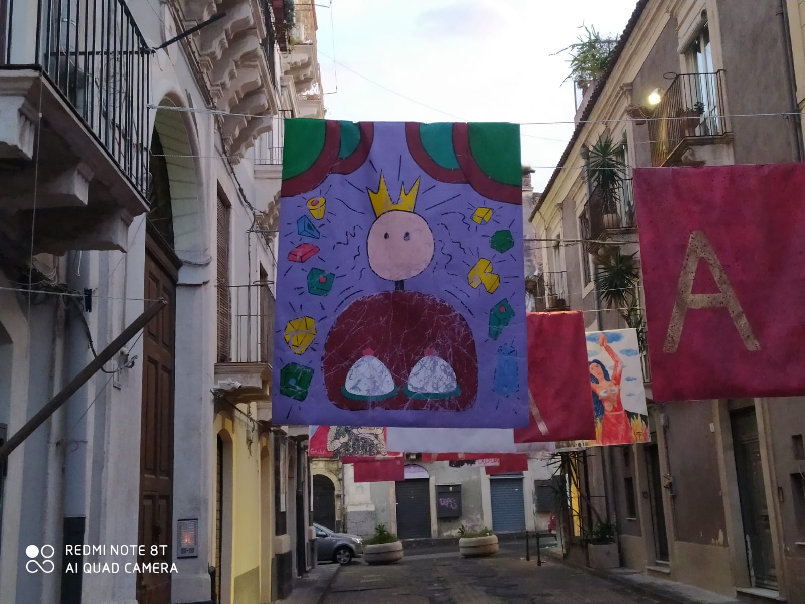In questi giorni di celebrazioni agatine, via di Santa Barbara si è trasformata in una galleria d'arte. Arazzi particolari sono appesi ai fili che sporgono dai balconi. I teli verranno messi all'asta e il ricavato servirà ad acquistare delle telecamere. Guarda le foto