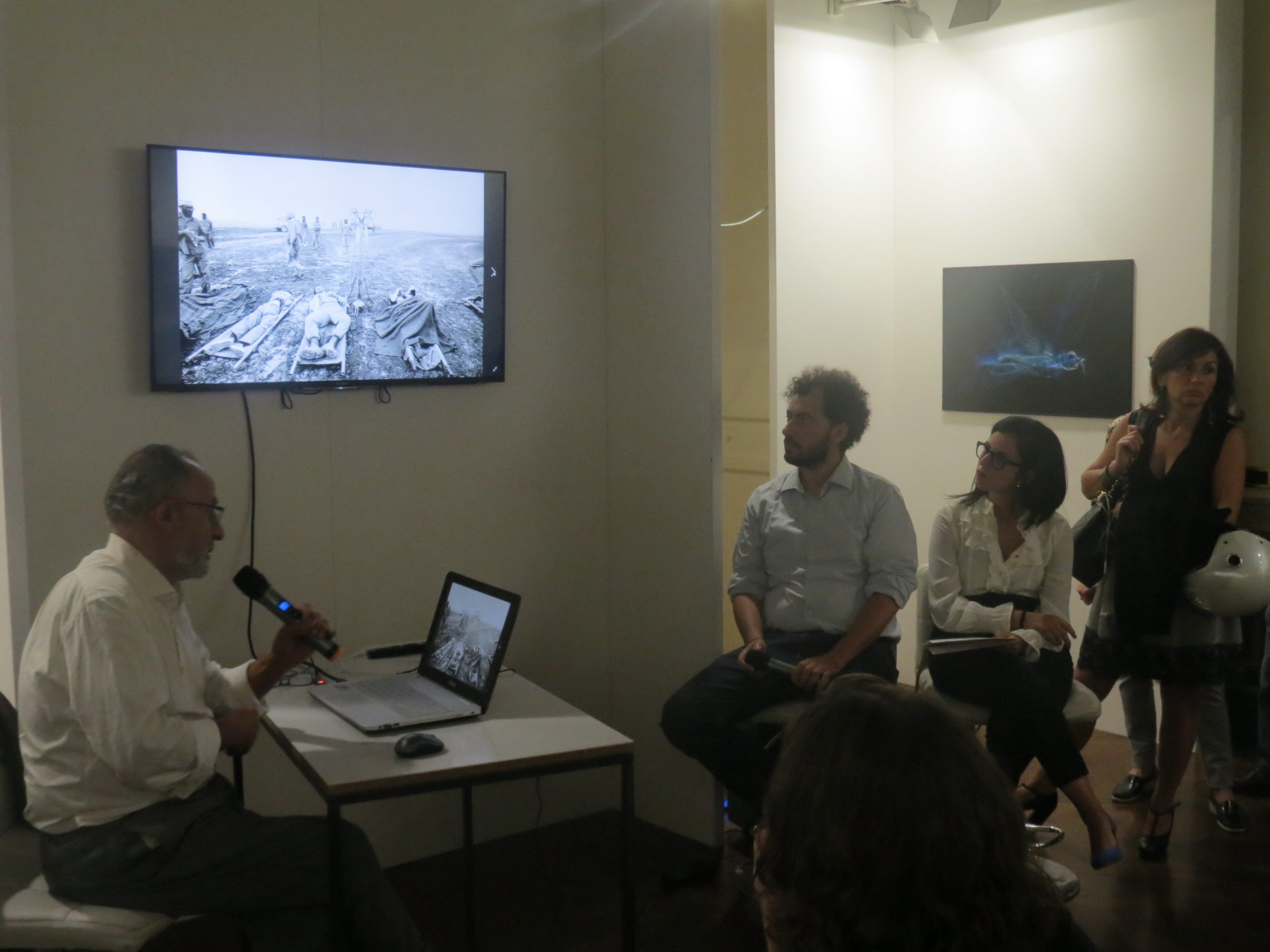 Manoocher Deghati ha viaggiato in 150 paesi diversi, informando attraverso le immagini il pubblico internazionale a dispetto delle distanze geografiche e culturali. «Portavo con me due valigie. Pesavano entrambe tantissimo, dentro c’erano circa 100 chili di materiale: macchine fotografiche, obiettivi, flash, l’ingranditore, il tank per sviluppare i filtri, sacchi di polvere da fissaggio, una macchina da scrivere per le didascalie. Poi, quando arrivavo nel luogo, mi toccava cercare un bagno in cui allestire la camera oscura». Aneddoti e ricordi riemergono insieme alle immagini, che il fotoreporter iraniano fa scorrere sullo schermo. «Nel 2011 sono andato a vivere Al Cairo, volevo un po’ di tranquillità – racconta – A 36 ore dal mio arrivo sono iniziate le manifestazioni contro Mubarak. La foto l’ho scattata dalla finestra del mio ufficio, ricordo ancora a terra i cadaveri e sul muro quel murales con scritto peace».