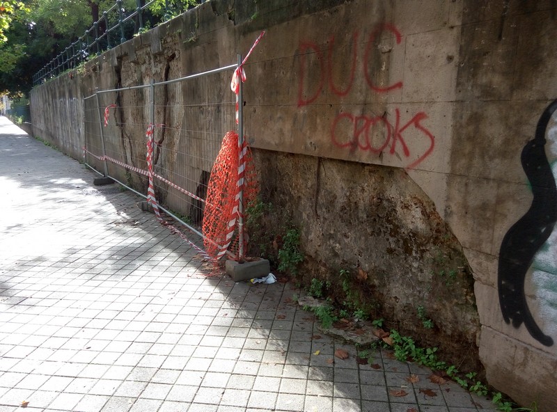 Il muro di contenimento di via Libertà che regge la sovrastante via Marchese Ugo non gode di buona salute, come è sotto l’occhio di tutti i passanti. Tra spaccature, radici che hanno provocato distacchi nel fronte in cemento della parete, erbacce, murales, danni alla ringhiera e piccole zone transennate, sembra di assistere all’ennesimo cantiere abbandonato.