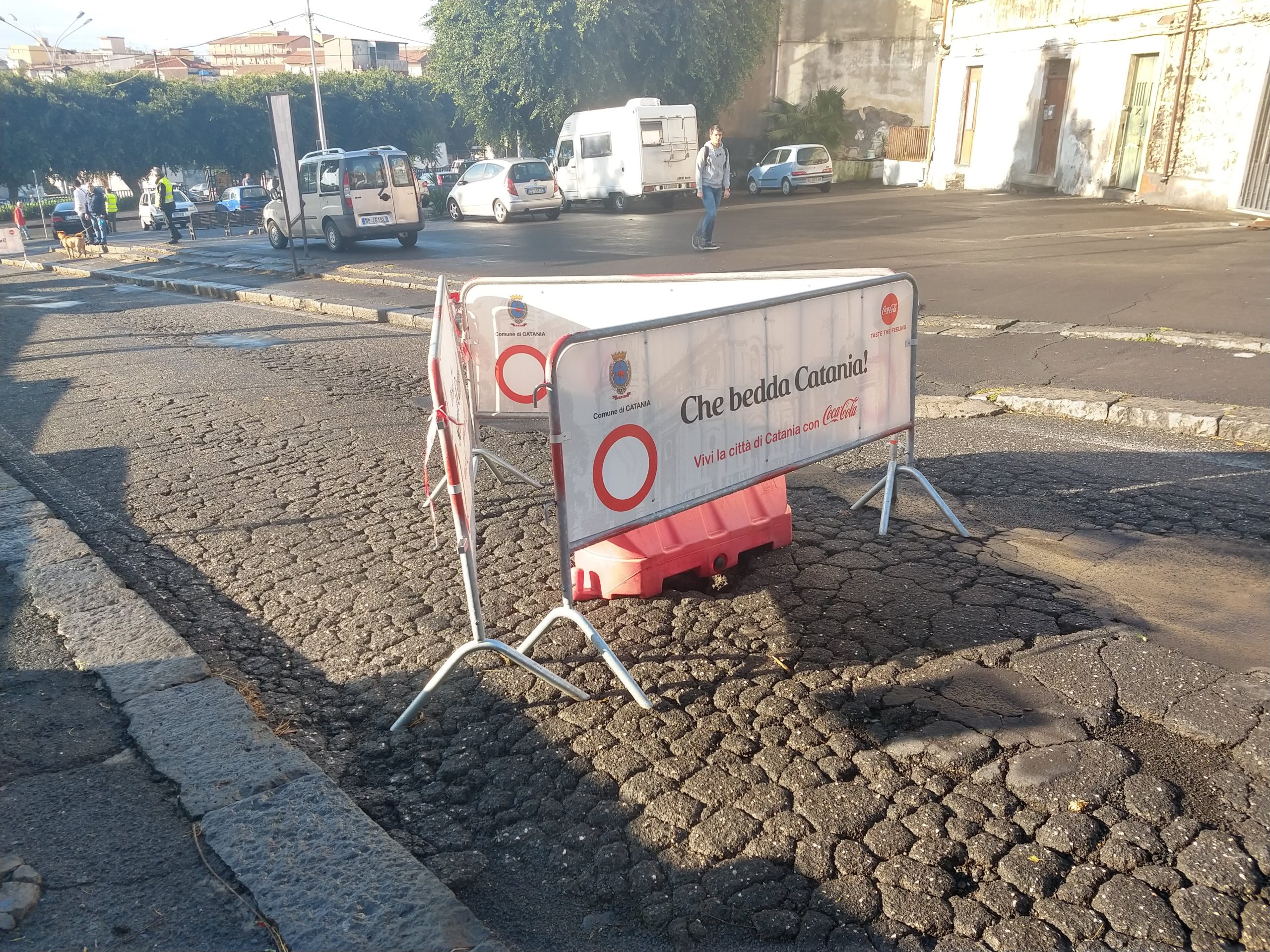 Si sente il rumore dell’acqua scorrere sotto, ma non si vede niente per via della barriera in plastica che la copre. La voragine che si è aperta in via Santa Sofia, a pochi metri dal lavatoio di Cibali, è proprio in mezzo alla strada. L’asfalto è dissestato e rattoppato in più punti, fino ad arrivare al grande foro a causa del quale, adesso, una delle principali arterie cittadine è chiusa al traffico, in attesa che si capisca come intervenire. La circolazione automobilistica in tutta la zona è completamente congestionata: le code, su tutte le strade limitrofe, sono lunghe centinaia di metri. A presidiare la zona due agenti della polizia municipale, in attesa di aggiornamenti su come evolverà la situazione.