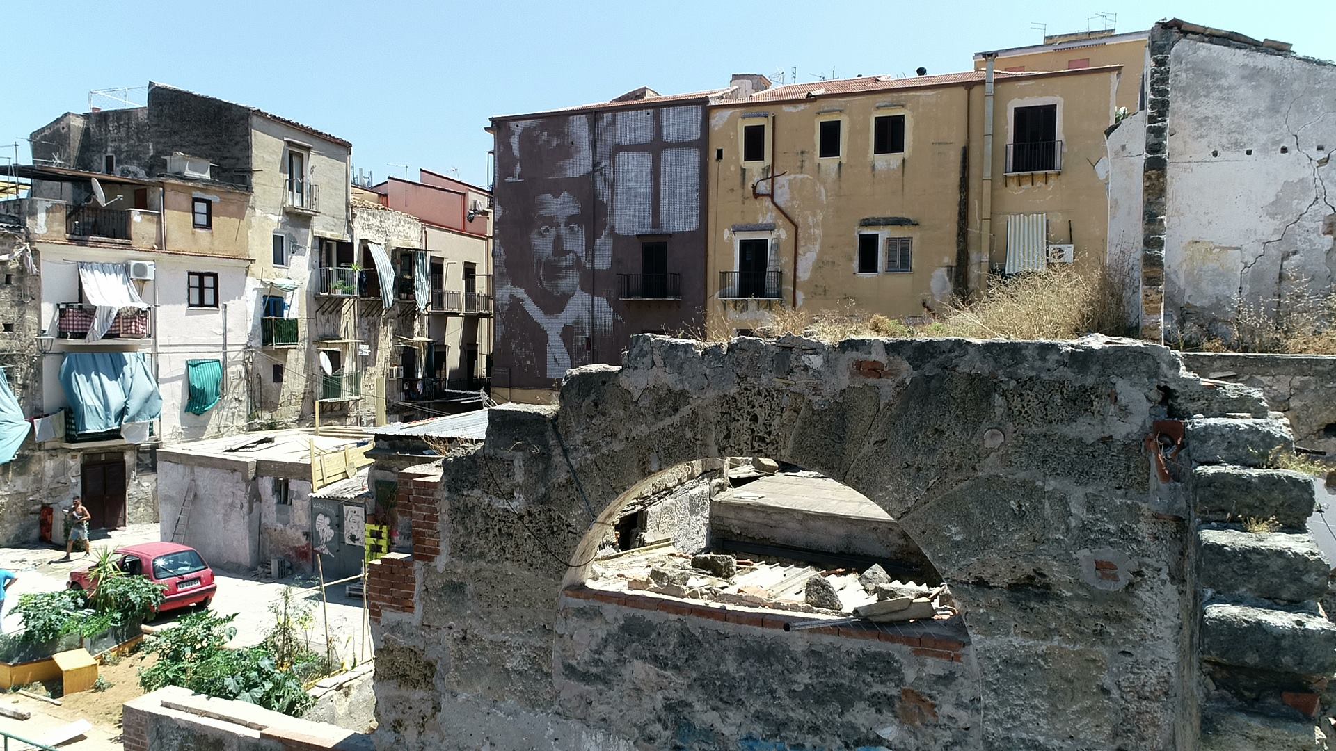 Dai sentieri in terra si dipartono dei vialetti, infilandosi nella boscaglia. Tra cartacce e buste di plastica alcuni conducono a delle bambinopoli sporche, con altalene smozzicate dai cani e scivoli vandalizzati, altri, apparentemente molto battuti, entrano tra pale di fico d’india e muri a secco, le cui pietre smosse formano un passaggio: ancora bivacchi di fortuna, un sacco a pelo, un lenzuolo, bottiglie di birra, dei giocattoli e un Pinocchio senza braccia. Le fontanelle sono tutte fuori uso, ad eccezione di quella rimasta accanto al campo da basket. Ancora zampilla faticosamente dell’acqua tra plastica ed erbacce. Il campo di basket ha un pezzo di ferro piegato in alto al posto del canestro e dei massi disposti intorno, caduti dalla collina in alto, col risultato che nessuno vi gioca. «I vigili non ci sono mai. Io li vedo solo quando chiudono i cancelli alle otto. Mi hanno detto che a volte stanno solo davanti a bagni pubblici, ma io non ne ho mai incontrato uno, nemmeno per caso», mi dice un ragazzo, che gioca a pallone con gli amici nello spiazzo centrale con delle mezze colonne palladiane lasciate lì, come denti cariati e spezzati. «Fino a pochi anni fa qui si poteva stare anche di sera, fino alle undici. Le luci funzionavano. Adesso è tutto rotto».