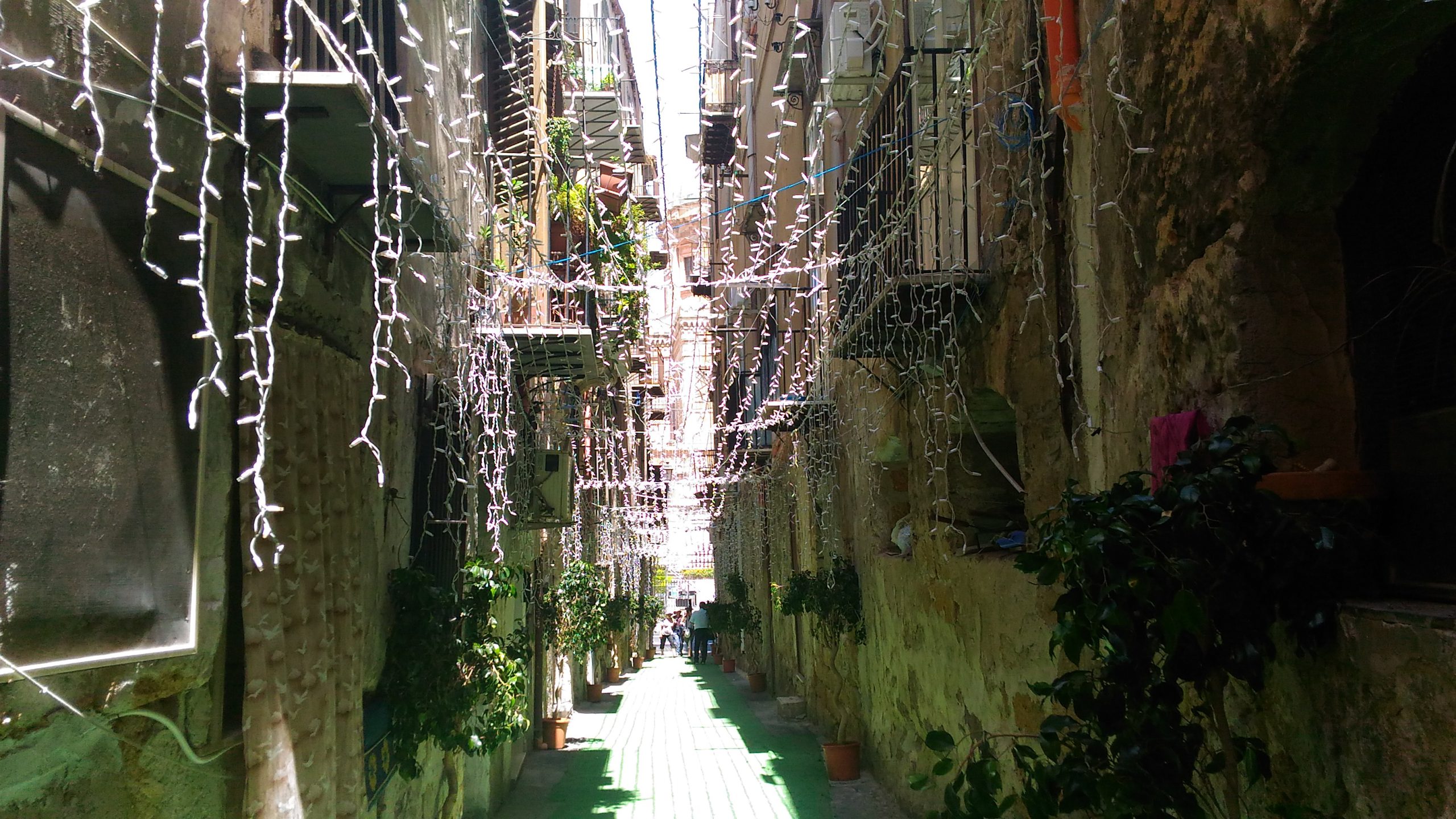 È una stradina nascosta, solo i turisti più attenti ci si addentrano. Si chiama vicolo Brugnò e vanta una vista frontale invidiabile che si affaccia direttamente sulla Cattedrale. La maggior parte dei palermitani che passeggia lungo corso Vittorio Emanuele non ci fa caso, anche se c’è un periodo dell’anno in cui non si può proprio fare a meno di notarlo. È il periodo in cui Palermo si prepara per il festino di Santa Rosalia. «Tutto quello che si vede rispecchia una tradizione delle famiglie che vivono in questo vicolo. Siamo noi che abbiamo le case qui che mettiamo questi addobbi, le luci e la statua della santuzza» racconta Maria Marraffa, una giovane donna che nella stradina ha la sua casa. Mentre parla sbuccia distrattamente una cipolla che lascia cadere dentro a una pentola, si prepara per il pranzo e non fa più caso alla gente che le chiede di tutti quegli addobbi. «Montiamo le luci intorno al 6 luglio e le smontiamo il 16» torna a dire la ragazza, mentre i bambini si rincorrono per tutto il vicolo.