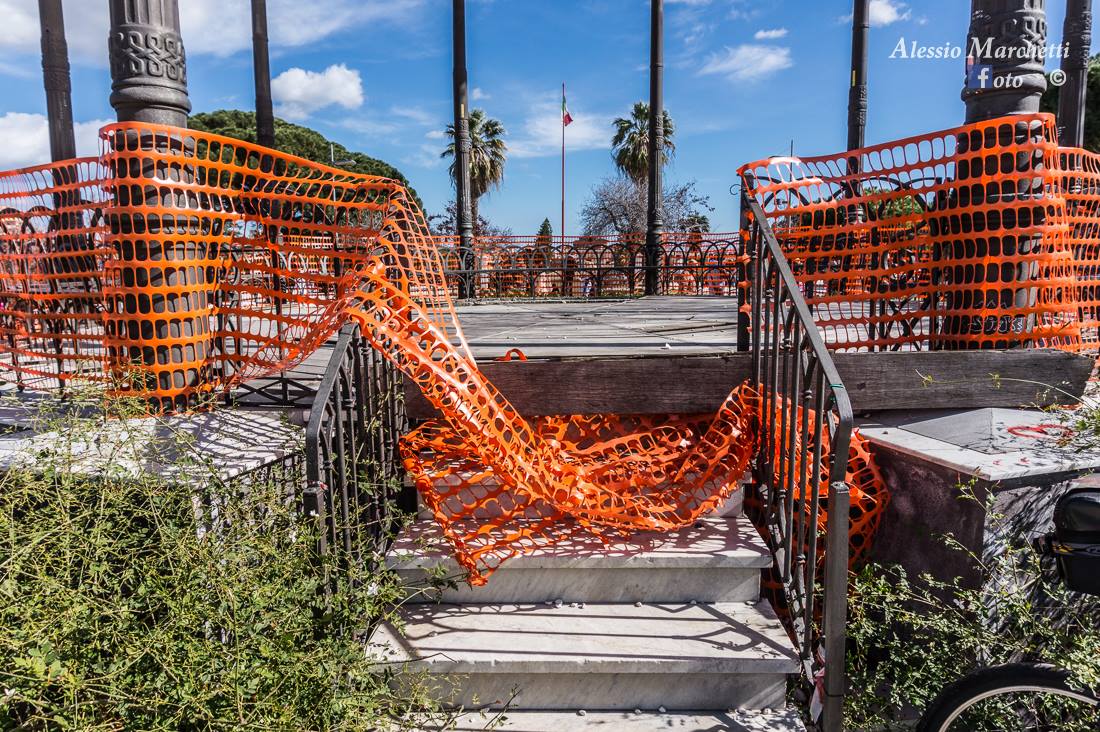«Sicuramente è una situazione pericolosa: le pedane di legno non sono fisse, basta metterci un piede e si spostano. Non solo soltanto i buchi il problema, è tutto il resto», commenta Marchetti. Dal momento del suo arrivo alla villa Bellini, a metà mattinata, «ci sarà voluto al massimo un minuto prima che vedessi un bambino essere richiamato da sua madre perché stava spostando la plastica e stava andando a giocare al chiosco della musica». Lui pensava che, visto lo stato di abbandono della struttura, quell’area non fosse frequentata, «invece c’erano almeno una cinquantina di ragazzini, molti dei quali incuriositissimi». «Sono bambini – prosegue Alessio Marchetti – avevano immaginato che chissà cosa ci fosse sotto quelle travi. Sparavano le stelle filanti dentro ai buchi».